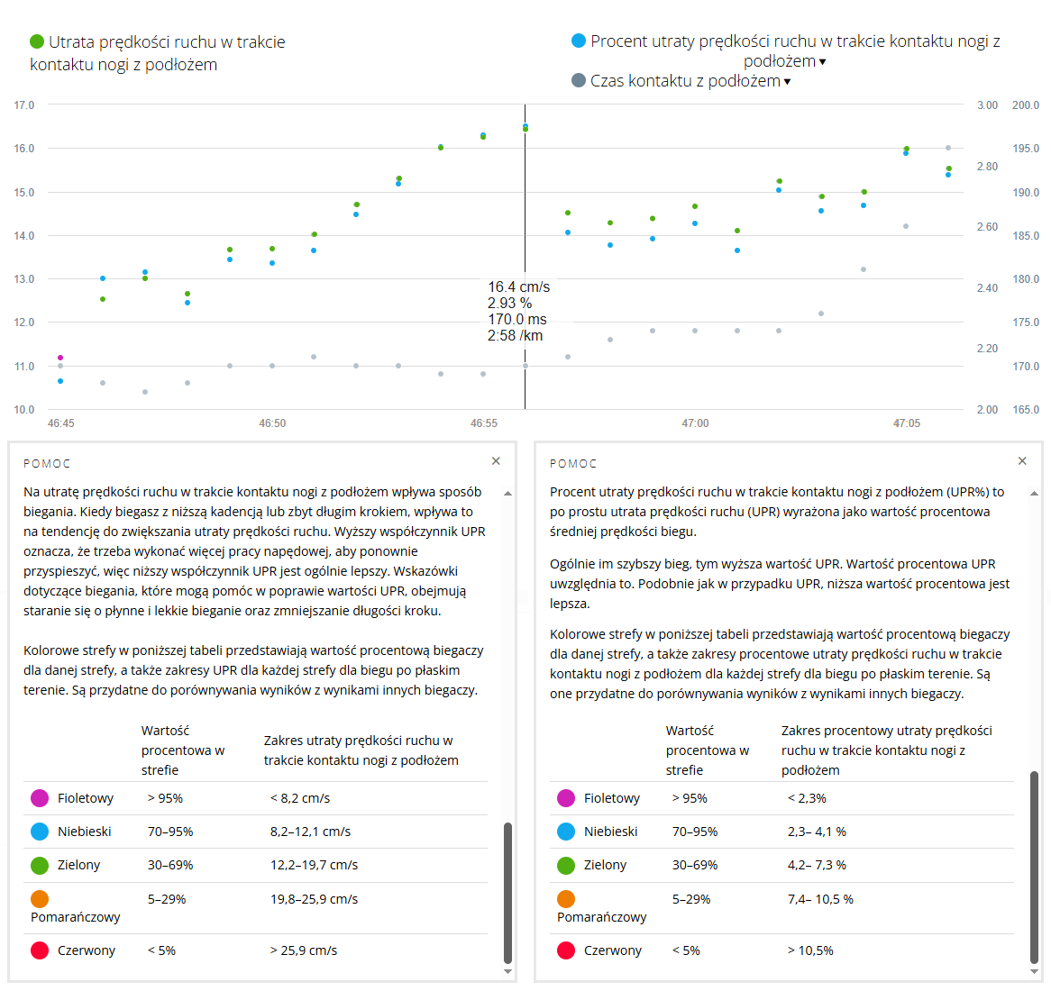 Na wykresie zaznaczona jest najwyższa wartość ssl = 16.4cm/s. Odpowiada temu spadek prędkości o 2.93% przy gct = 170ms. Chwilowe (uśrednione z sekundy) tempo biegu 2:58/km (561.8 cm/s). Podczas hamowania spadek do 545.4 cm/s, co daje jakieś 3.03/km. Z pierwszych obserwacji i porównań z ssl z naszych eksperymentów przy tym samym tempie, ale bieganych na asfalcie wychodzą te wartości niższe średnio o jakieś 10-15cm/s. Asfalt, karbon i może też miejsce pomiaru (miednica) wpływają na tę różnicę. Tutaj można sobie zobaczyć jak narasta ssl i jakie osiąga maksymalne wartości. Tutaj pełny opis zagadnienia.