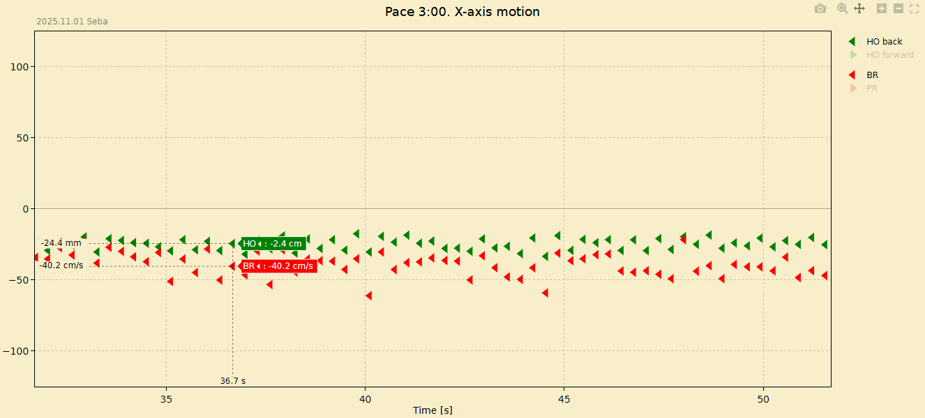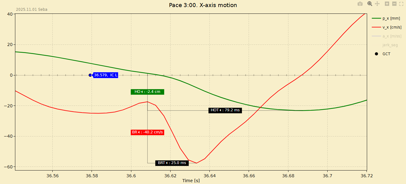 HO⏴mierzony jest nie od IC jak to było w przypadku VO⏷ lecz od lokalnego minimum BR⏴(rozwinę to zagadnienie za chwilę) do zielonego dołka pozycji oznaczającego maksymalne cofnięcie miednicy. Na wykresie mamy widoczną wartość HO⏴= -2.4cm. Czas, w którym miednica cofa się wynosi HOT⏴= 79.2ms. Dla analizowanego kroku GCT= 179.2ms.