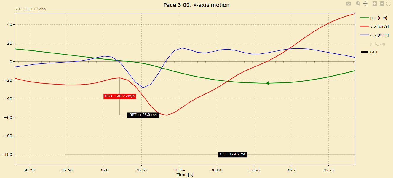 Metryka SSL mierzona jest tam od IC, ale nie zawsze początek hamowania (lokalne minimum - widoczne jako czerwona górka pod poziomą osią zerową) pokrywa się z IC. Na kroku wcześniejszym widać lepiej różnicę (około jednego frejma) pomiędzy tymi charakterystycznymi punktami przebiegu prędkości miednicy w IC i w lokalnym minimum. W przypadku biegu Sebastiana tych frejmów różnicy jest aż siedem (7 kresek na osi zerowej na wykresie poniżej), co w przeliczeniu daje około 29ms. To rodzi problem interpretacyjny. Poza tym SSL jest metryką serwerową obliczaną z pozostałych metryk, więc nie można się nią sugerować projektując algorytm dla BR⏴, czyli dla realnego pomiaru prędkości poziomej czujnikiem na miednicy.