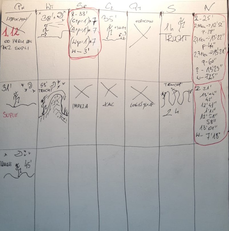 Jako, że nie nastąpił żaden przełom, postanowiłem pociągnąć wpis o kolejny tydzień. Czerwonym kolorem zaznaczam dni, w których naciągnąłem granice swoich sił. Czy je przesunąłem, nie wiem, za mało tego, ale odnotowuję to po prostu. Dodam jeszcze, że przestałem się suplementować i chyba dobrze, bo więcej sił to mocniejsze treningi i większe zmęczenie, wrócę do supli, gdy przygotuję się do jakiejś akcji kilkutygodniowej. Tak będzie bezpiecznie.
